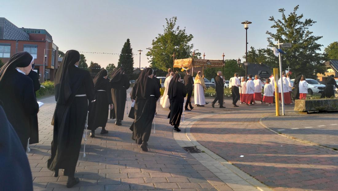 Am Hochfest des Leibes und Blutes (8. Juni) feierten wir abends zusammen mit der Pfarrgemeinde das Festhochamt in der Christus-König-Kirche. Von dort aus führte die Prozession über den Hof des Jungeninternates zum Haus St. Agnes zum ersten Altar an der Franziskuskapelle.
