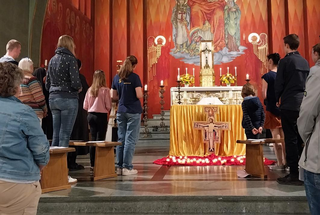 Mit eigenen Ein-Wort-Fürbitten konnten alle ihr Licht vor das franziskanische Kreuz und das Allerheiligste bringen, um die Bitten vor Gott zu tragen. Pater Kilian erteilte am Ende der Anbetung allen den sakramentalen Segen. Eine freudige und erfüllte Atmosphäre machte sich breit.